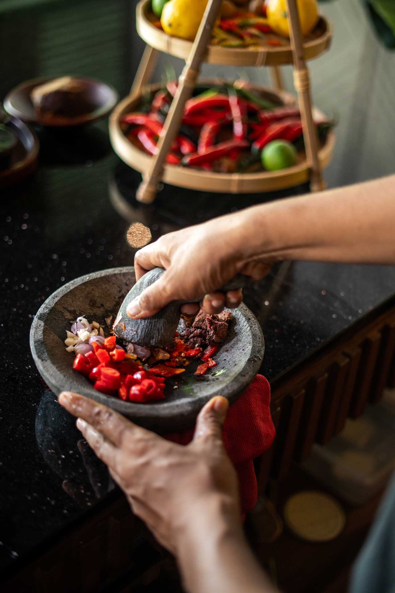 Back in the open-air kitchen, the menu follows what the garden offers — or takes shape around a personal request, guided by curiosity and taste. Food is prepared by hand. You grind, stir, and work slowly, learning through movement and observation, just as knowledge has been passed on for generations.